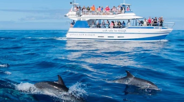 | Wer kein Freud von wilden Kurvenfahrten und steilen Schluchten war, der erholte sich bei einer Delfin- und Wal-Tour vor der Küste Gran Canarias. Nur ein paar Meilen von der Küste entfernt, konnten verschiedene Arten von Delfinen und Walen in kanarischen Gewässern beobachtet werden. Es war ein wunderbares Erlebnis, die Delfine in Ihrem natürlichen Umfeld, springend, jagend oder auch im Fahrwasser des Katamarans spielend, zu sehen. Man konnte vom Katamaran aus allen Blickwinkeln die Tiere sehen oder durch die Glasscheiben des Glasbodens beobachten. | ![]() |